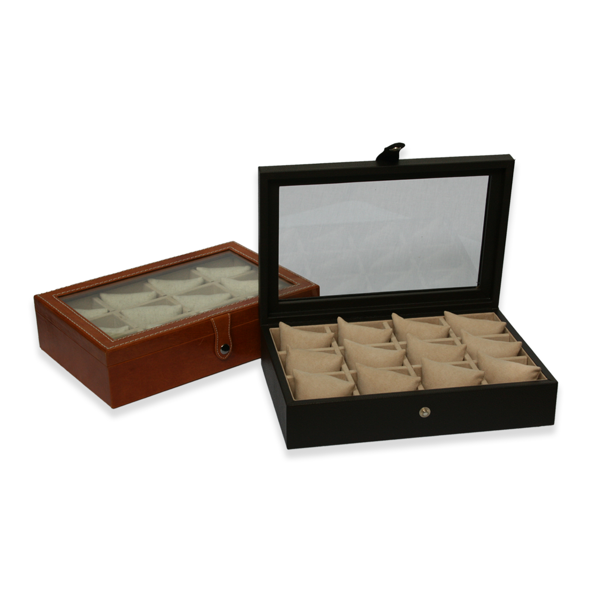 Caja para 12 relojes con tapa de vidrio y tapa cerrada