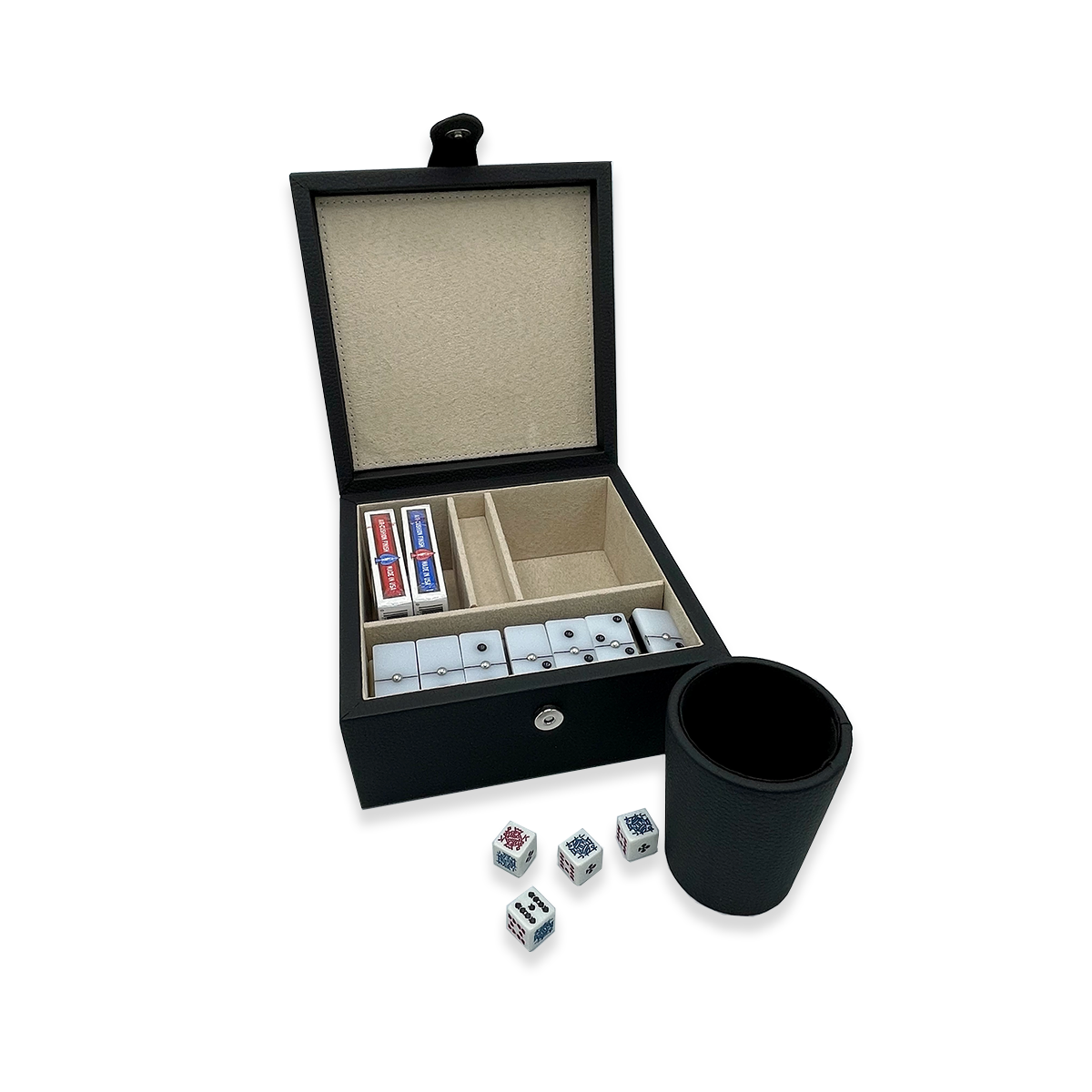 Caja con dominó, cubilete y juego de barajas